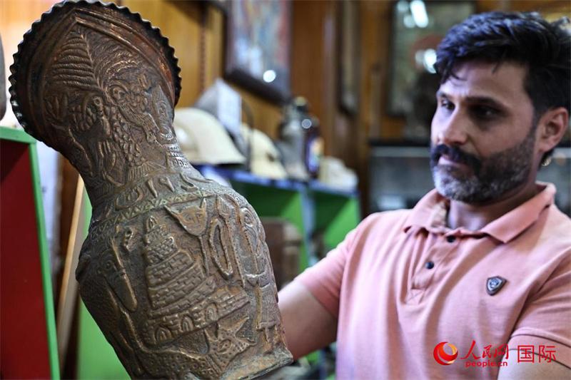 一名参观者在欣赏一个旧铜壶。人民网 伊纳斯·易卜拉欣摄