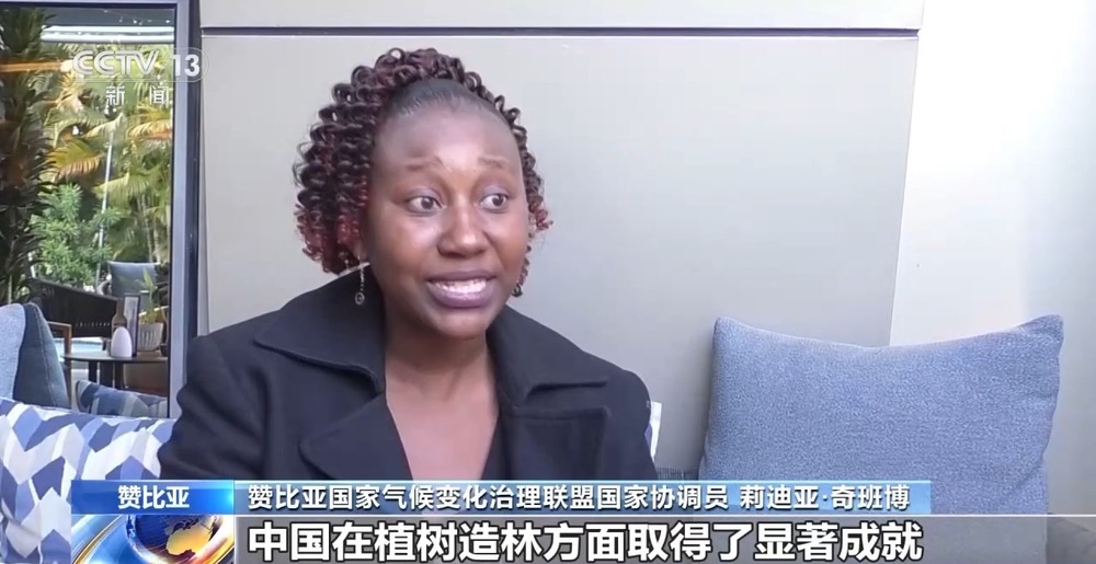 赞比亚国家气候变化治理联盟国家协调员莉迪亚·奇班博:中国在植树造林方面取得了显著成就,中国还通过种草来缓解沙尘暴的风险,这些都是中国在环境治理方面所取得的成就,有助于民众更加适应生活环境。