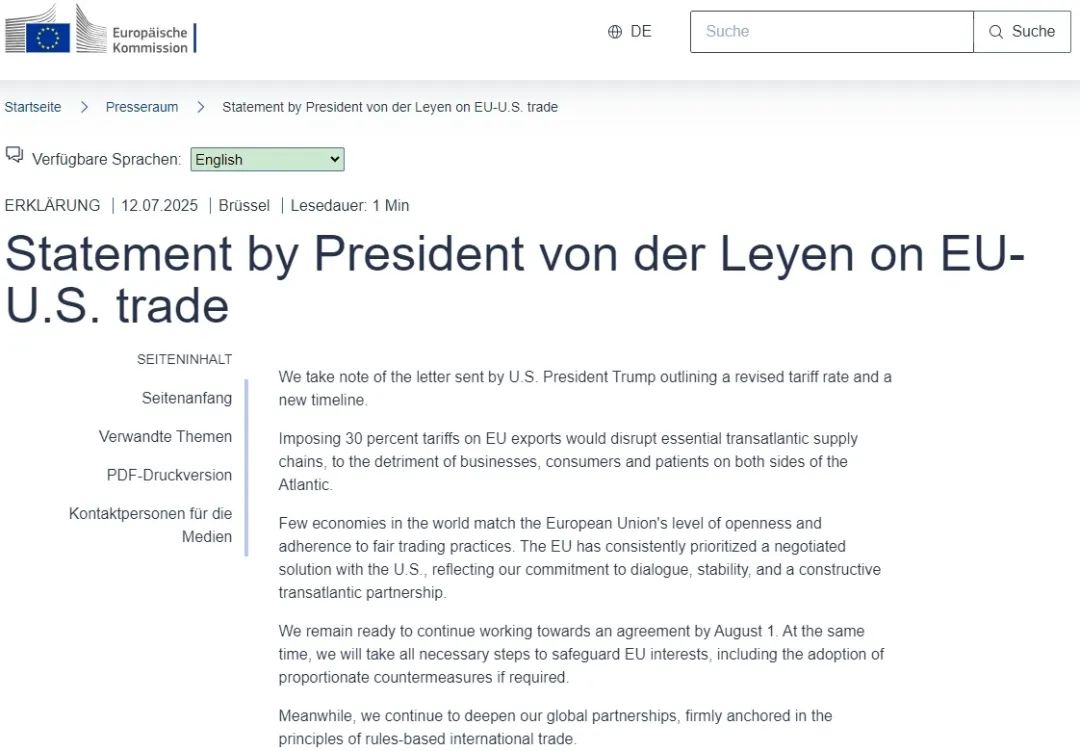 声明说,欧盟仍然准备继续努力,在8月1日前达成协议。与此同时,将采取一切必要措施维护欧盟的利益,包括在必要时采取相称的反制措施。同时,欧盟也将继续深化全球伙伴关系,坚定地以基于规则的国际贸易原则为基础。