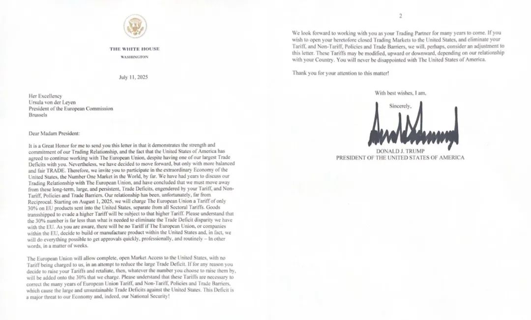 美国总统特朗普12日发出两封关税威胁信函,称自8月1日起对从欧盟、墨西哥进口的商品分别征收30%关税。美国最大的贸易伙伴欧盟当即表示,必要时会予以反制。