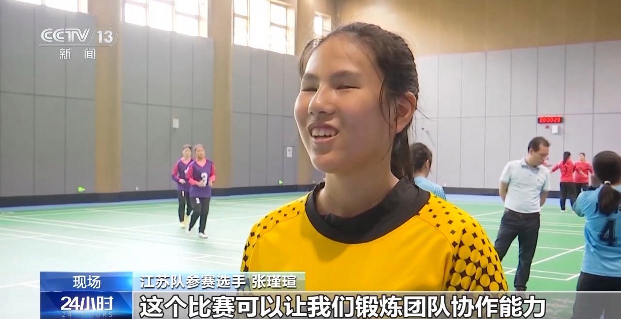 江苏队参赛选手 张瑾瑄:这个比赛可以让我们锻炼团队协作能力,在场上互相传球,互相鼓励,也能让我们提高自信心,在场上锻炼我们随机应变的能力,赢球时也让我们更加有自信。