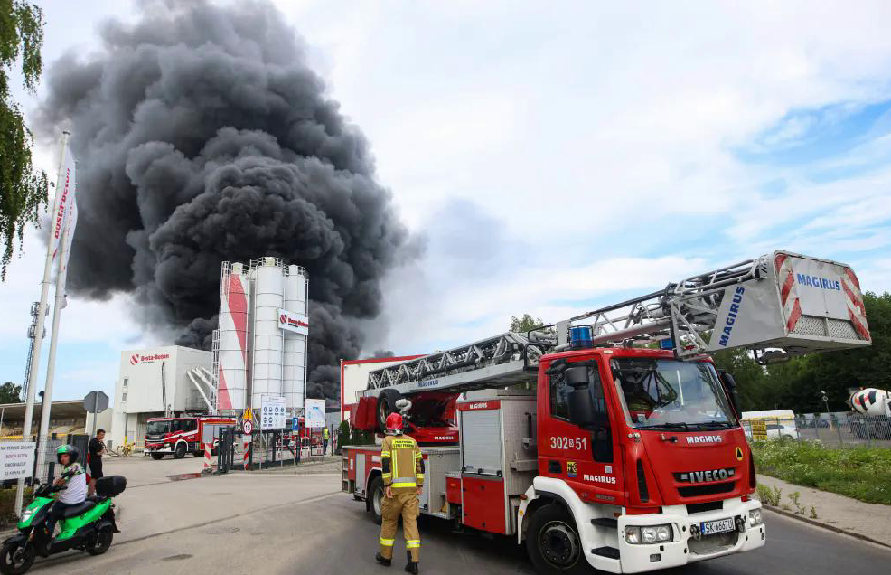 当地时间14日,波兰西里西亚省一家工业厂房突发大火,灭火行动正在持续进行。