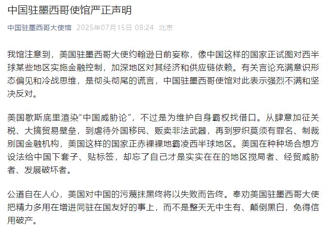 我馆注意到,美国驻墨西哥大使约翰逊日前妄称,像中国这样的国家正试图对西半球某些地区实施金融控制,加深地区对其经济和供应链依赖。有关言论充满意识形态偏见和冷战思维,是彻头彻尾的谎言,中国驻墨西哥使馆对此表示强烈不满和坚决反对。