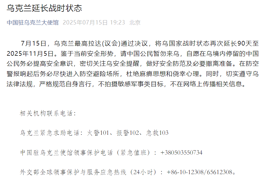 15日,中国驻乌克兰大使馆微信公众号发布消息,乌克兰延长战时状态,鉴于当前安全形势,提醒在乌境内停留的中国公民务必提高安全意识,全文如下: