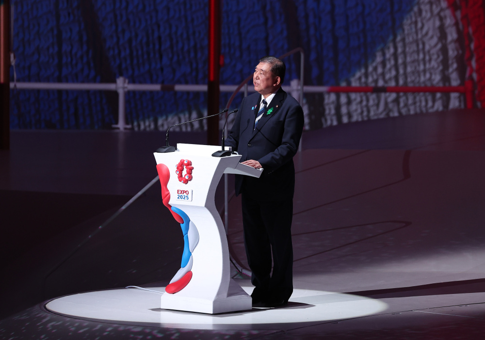4月12日,在日本大阪,日本首相石破茂在世博会开幕式上致辞。新华社记者贾浩成摄