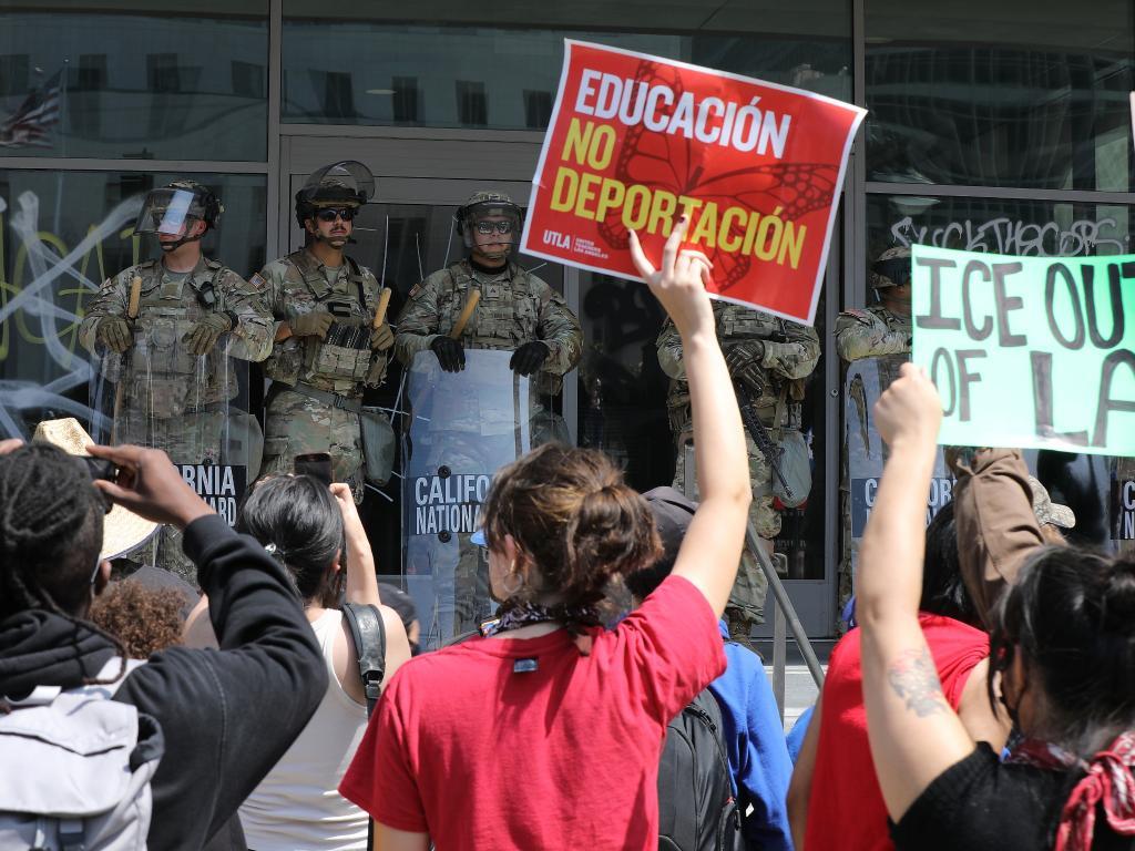 6月9日,在美国加利福尼亚州洛杉矶一处联邦机构建筑外,示威者与国民警卫队人员对峙,抗议特朗普政府大肆抓捕非法移民和调遣国民警卫队进驻洛杉矶地区。新华社发(邱晨摄)