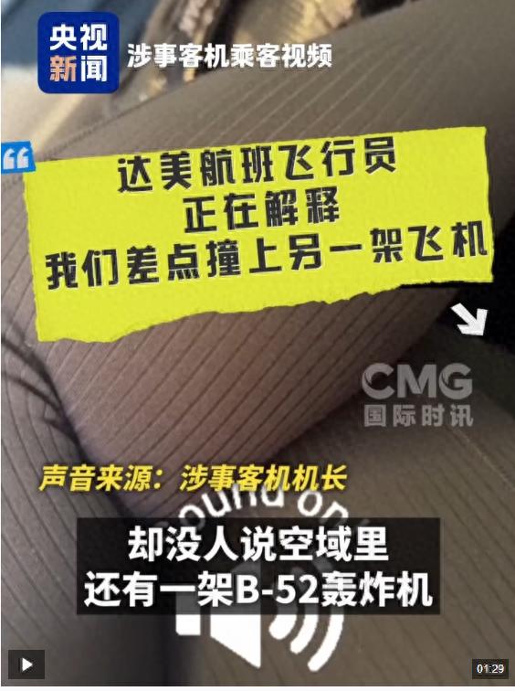 当地时间7月18日,美国达美航空公司从明尼苏达州明尼阿波利斯-圣保罗国际机场飞往北达科他州迈诺特国际机场的3788号航班,在接近迈诺特国际机场准备降落时,飞行员突然采取“激进机动措施”,并随后通过机舱广播向乘客道歉,解释称此举是因为突然发现一架B-52轰炸机出现在其飞行航道上。这一事件被乘客拍下视频并发布在社交媒体上。