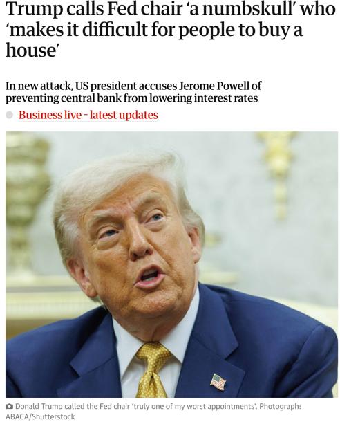 7月初以来,特朗普多次就利率政策向鲍威尔发难,指责其拒绝配合白宫提出的统一降息路径,结果造成房地产市场成本飙升,严重压制中产家庭的购房能力。尤其在7月22日的一场闭门筹款活动上,特朗普更是罕见地使用“numbskull(傻瓜)”一词形容鲍威尔,并公开表示“他还有8个月就该走人”。