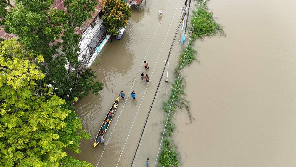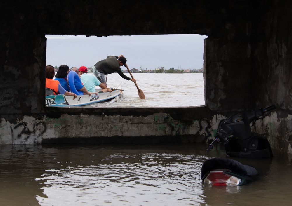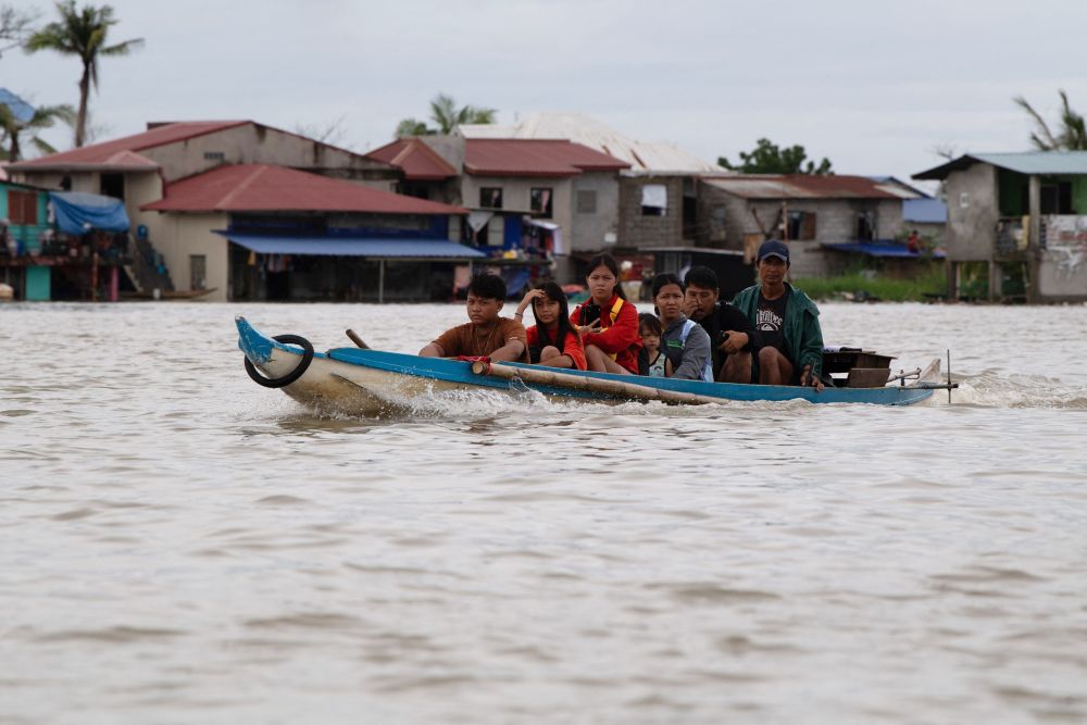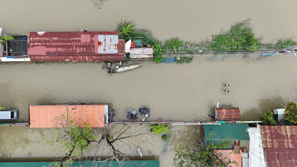 7月25日,在菲律宾卡伦皮特,船只从水淹的房屋旁驶过。新华社/法新
