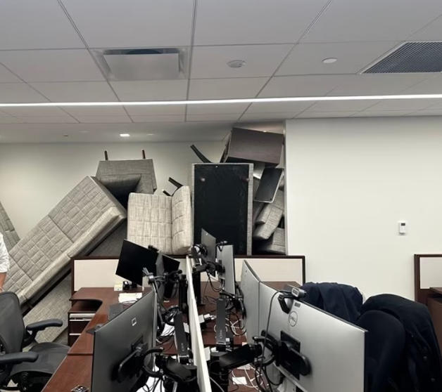 听到枪声后,楼内员工拼命用沙发、椅子等物堵住房门