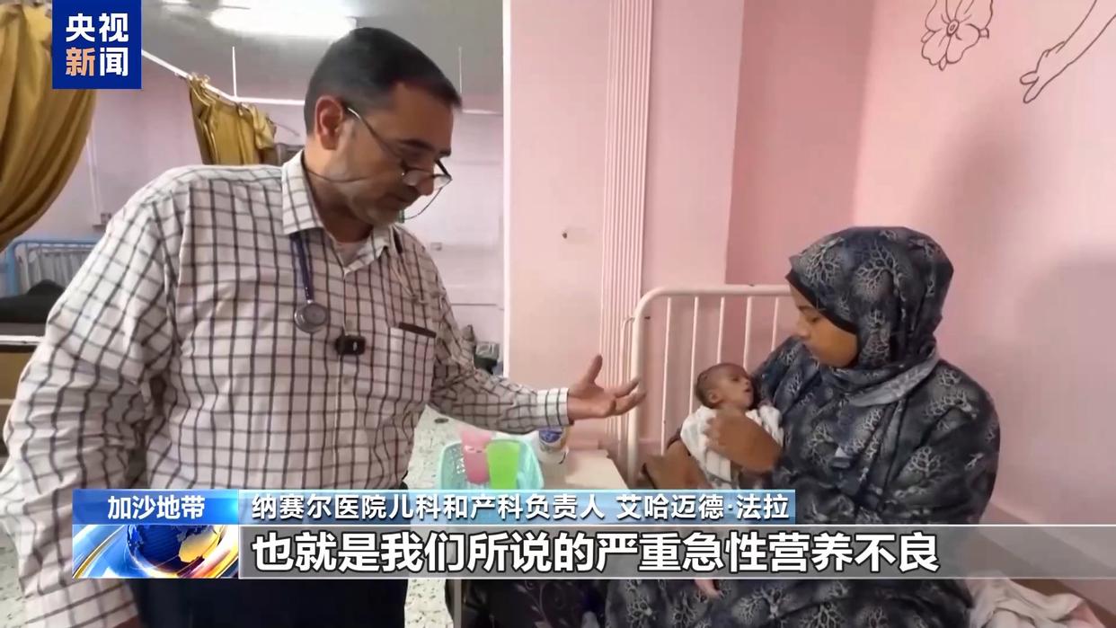 纳赛尔医院儿科和产科负责人 艾哈迈德·法拉:她没有肌肉了,现在就是皮包骨头,这表明孩子已经进入严重的营养不良阶段,也就是我们所说的严重急性营养不良。如果你注意到的话,就连孩子脸颊上的脂肪组织都已经没有了。