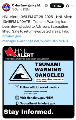 除了夏威夷以外,据日本共同社31日报道,日本47个都道府县中的22个观察到海啸波;海啸警报发出后,日本各地多达200万人被命令撤离。