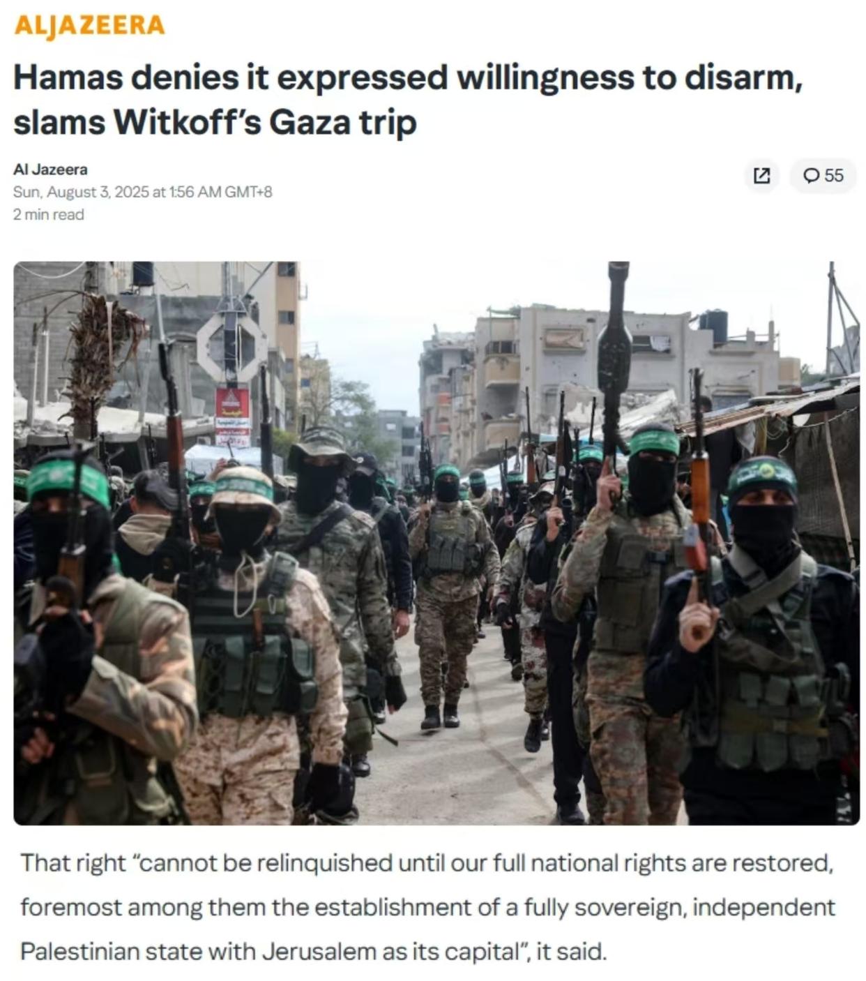 当地时间8月2日,巴勒斯坦伊斯兰抵抗运动(哈马斯)发表声明,回应美国中东问题特使威特科夫称哈马斯已“准备好解除武装”的言论。声明说,哈马斯不会解除武装,直至建立一个独立的拥有完全主权的巴勒斯坦国。