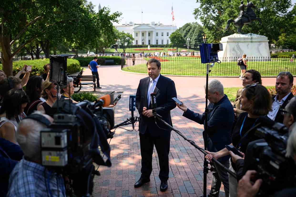 8月4日,德国副总理兼财政部长克林拜尔在华盛顿会见记者。新华社/法新 “作为欧洲人,我们必须更强硬。”克林拜尔在和美国财政部长贝森特会晤前说,“这样我们在面对美国时就可以变得更加自信。不是对抗美国,而是和美国对话”。