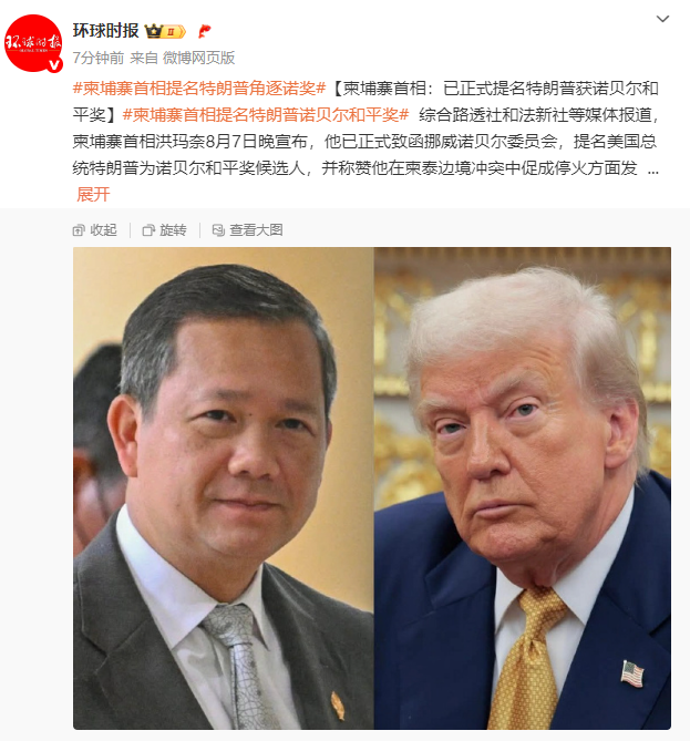 据环球时报综合路透社和法新社等媒体报道,柬埔寨首相洪玛奈8月7日晚宣布,他已正式致函挪威诺贝尔委员会,提名美国总统特朗普为诺贝尔和平奖候选人,并称赞他在柬泰边境冲突中促成停火方面发挥的作用。而在不久前,特朗普把威胁对柬埔寨加征关税的税率从49%降至19%。