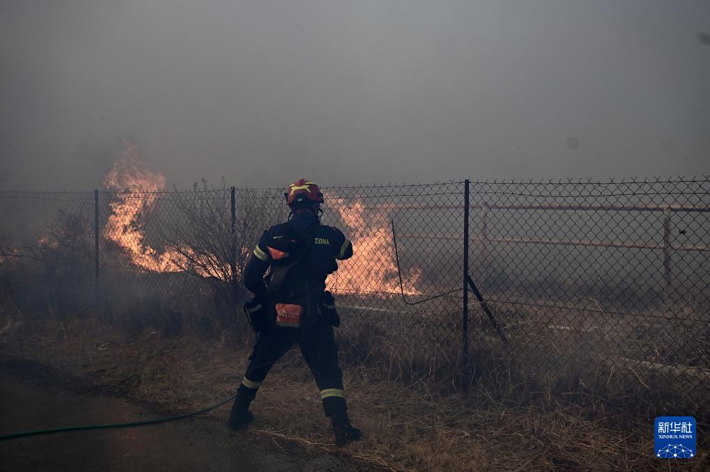 8月8日,希腊首都雅典东南约35公里的凯拉泰阿镇出现严重火情,消防员奋力灭火。新华社发(马里奥斯·罗洛斯摄)