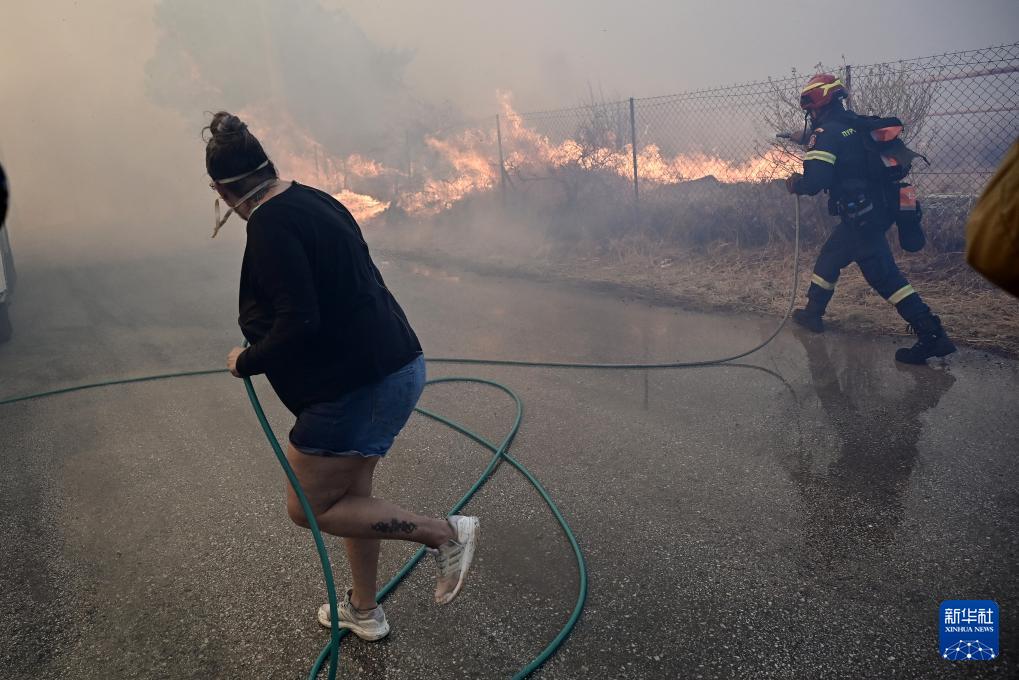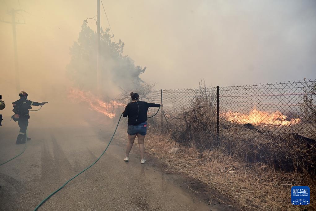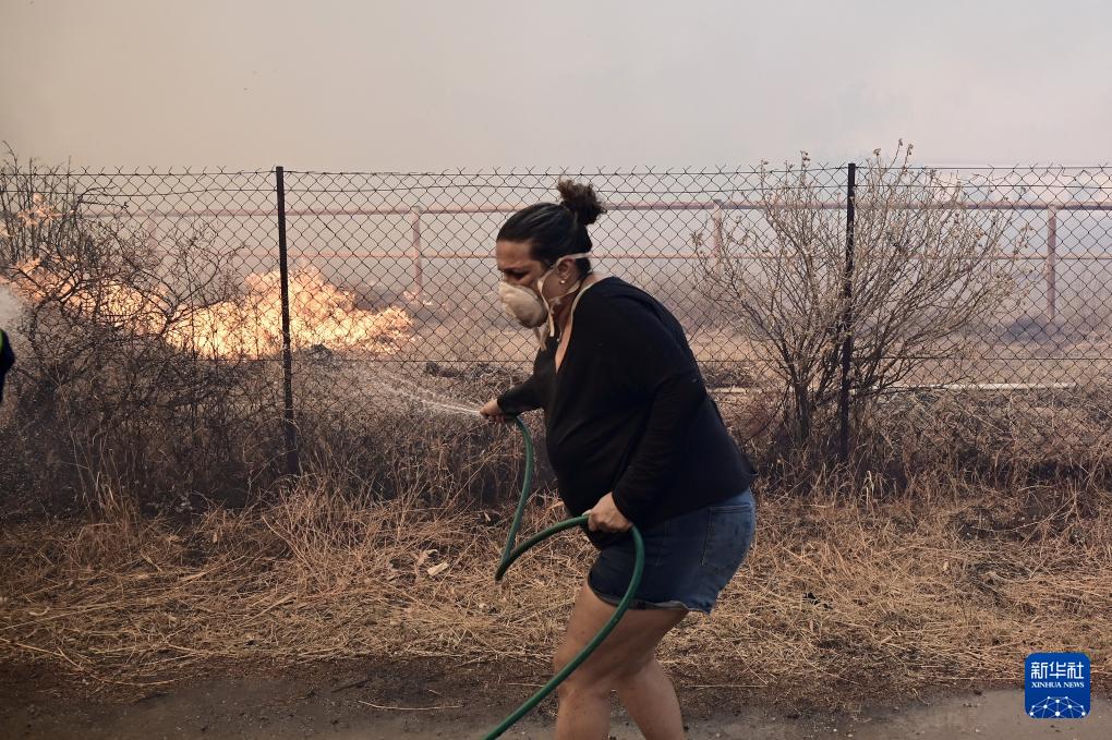 8月8日,希腊首都雅典东南约35公里的凯拉泰阿镇出现严重火情,居民奋力灭火。新华社发(马里奥斯·罗洛斯摄)