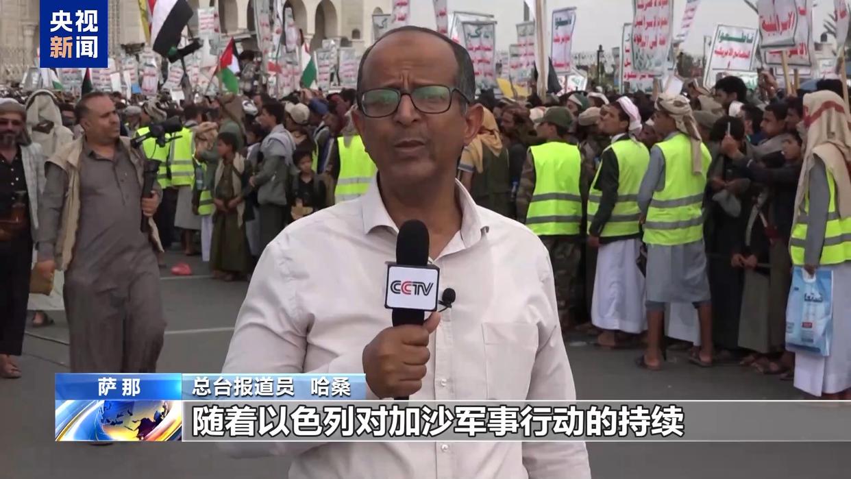 总台报道员 哈桑:随着以色列对加沙军事行动的持续,并有计划地实施饥饿和封锁政策,每周五在萨那七十广场举行的抗议集会仍将继续下去,以表达也门民众对加沙形势的愤怒,特别是针对以色列内阁最近的决定。