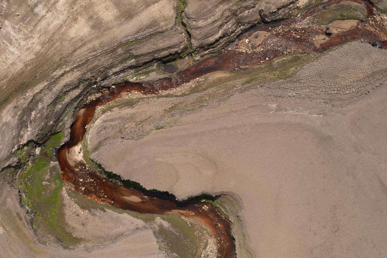 这是8月8日在英国约克郡拍摄的几近干涸的拜廷斯水库(无人机照片)。新华社发(乔恩·休珀摄)