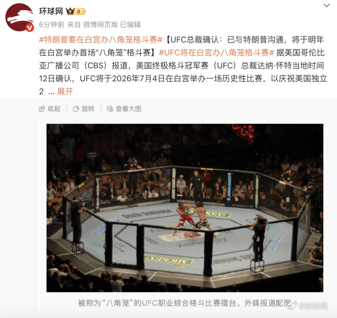据环球网援引美国哥伦比亚广播公司(CBS)报道,美国终极格斗冠军赛(UFC)总裁达纳·怀特当地时间12日确认,UFC将于2026年7月4日在白宫举办一场历史性比赛,以庆祝美国独立250周年,这也将是首次在白宫举办的“八角笼”格斗赛。