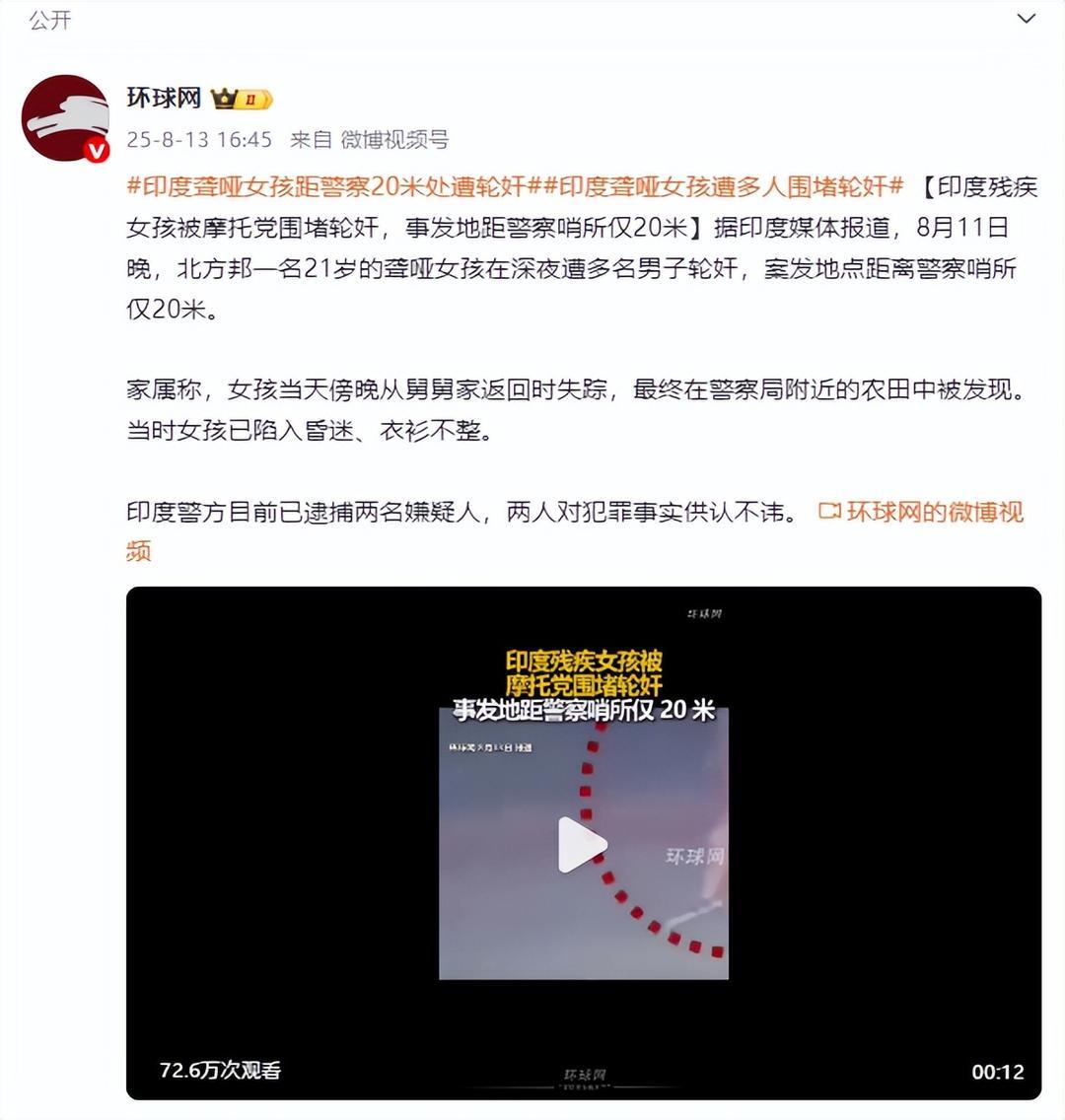 据印度媒体报道,8月11日晚,北方邦一名21岁的聋哑女孩在深夜遭多名男子轮奸,案发地点距离警察哨所仅20米。