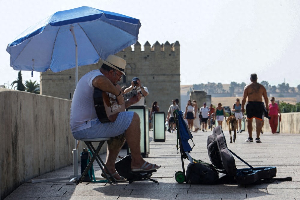 8月6日,在西班牙科尔多瓦,街头艺术家在阳伞下演奏。近日,西班牙持续遭遇高温天气。 新华社/欧新