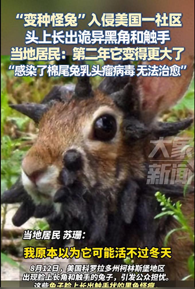 8月12日,美国科罗拉多州柯林斯堡地区出现脸上长角和触手的兔子,引发公众担忧。这些兔子脸上长出触手状的黑色怪瘤,看起来像科幻电影中才会出现的变种生物。