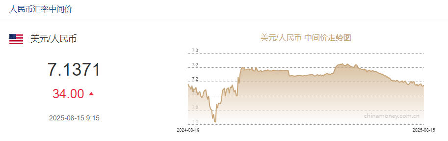 8月15日人民币对美元中间价报7.1371元 下调34个基点