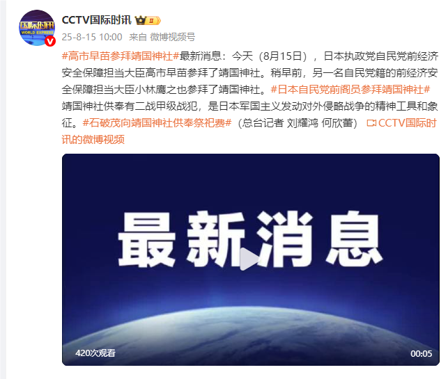 今天(8月15日),日本执政党自民党前经济安全保障担当大臣高市早苗参拜了靖国神社。稍早前,另一名自民党籍的前经济安全保障担当大臣小林鹰之也参拜了靖国神社。靖国神社供奉有二战甲级战犯,是日本军国主义发动对外侵略战争的精神工具和象征。(总台记者 刘耀鸿 何欣蕾)