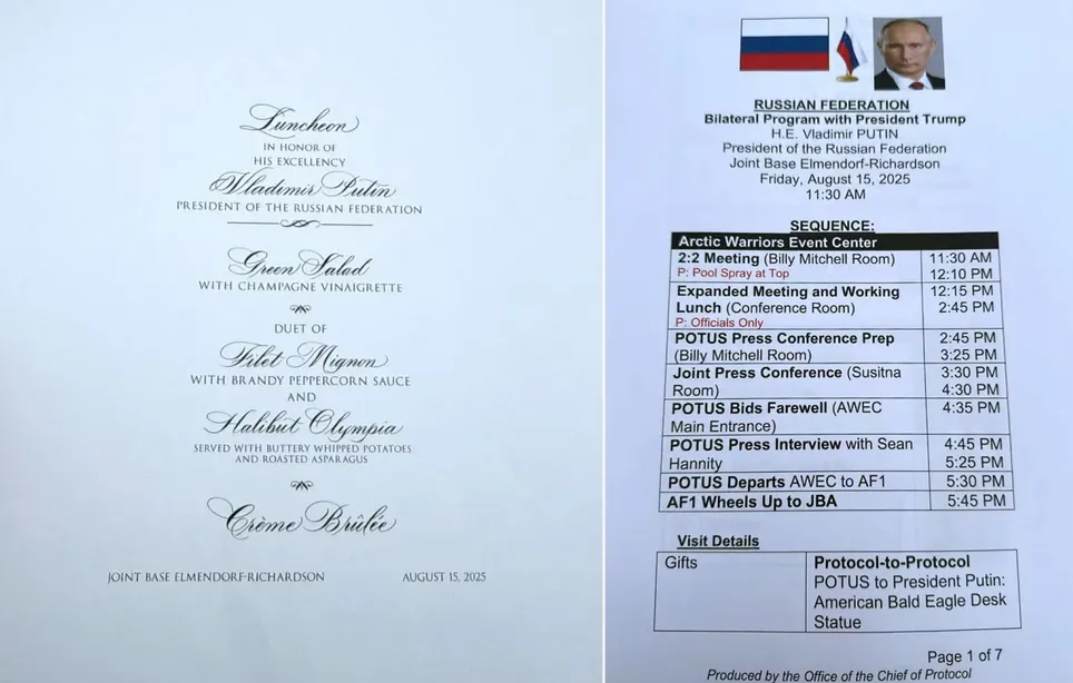 第六、七页详细记载因故未能举行的午宴方案。原计划以“尊贵的弗拉基米尔·普京阁下”名义举办的午宴,菜单包括绿蔬沙拉、奥林匹亚比目鱼配腓力牛排及焦糖布丁甜点。此外,根据曝光的信息,座位图显示了特朗普与普京相对而坐:美总统右侧依次为国务卿鲁比奥、国防部长赫格塞思及白宫幕僚长苏珊·怀尔斯,左侧为财长贝森特、商务部长卢特尼克及中东问题特使威特科夫;普京总统两侧分别为外长拉夫罗夫及总统助理乌沙科夫。