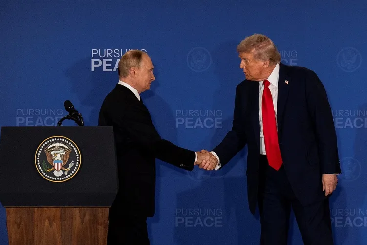 8月15日,美国总统特朗普(右)与俄罗斯总统普京在美国阿拉斯加州安克雷奇市埃尔门多夫-理查森联合军事基地举行会晤后共同出席联合记者会。图源:视觉中国