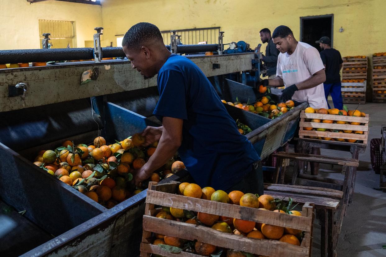 8月19日,在巴西里约热内卢州坦瓜市,工人在一处橙子分拣中心工作。新华社记者 王天聪 摄