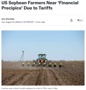△彭博社发表评论指出,关税使美国豆农处于“财务悬崖”,无法在与中国的长期贸易战中生存。