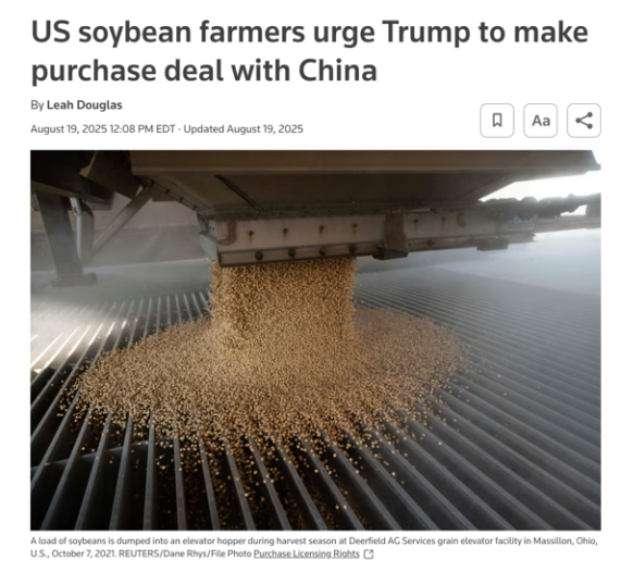当地时间8月19日,美国大豆协会致信美国总统特朗普,强调农民已因关税负担、销量锐减、成本上升而承受巨大财务压力,呼吁政府调整政策,特别是尽快与中国达成新的贸易协议。这封信既是对政策的呼吁,也折射出美国农业在全球市场格局重塑中的困境。