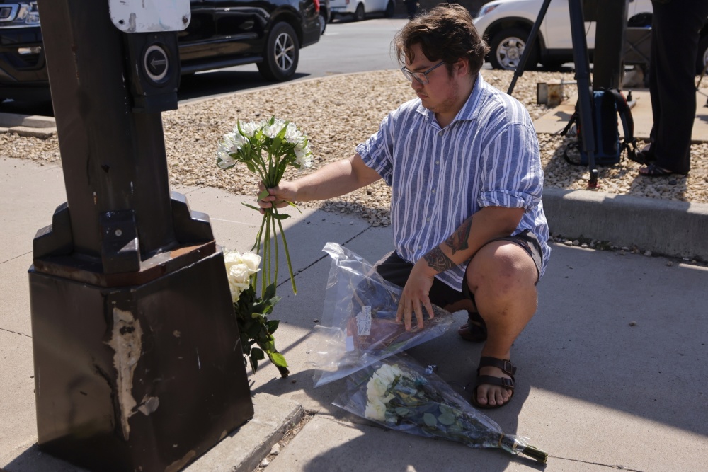 8月27日,在美国明尼苏达州明尼阿波利斯市的枪击事件现场附近,一名男子摆放鲜花。新华社/美联