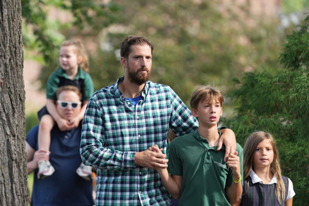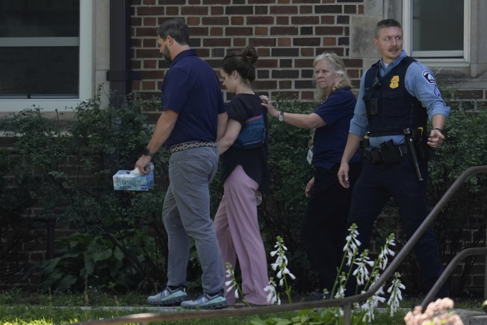 8月27日,在美国明尼苏达州明尼阿波利斯市的枪击事件现场,家长安慰孩子们。新华社/美联