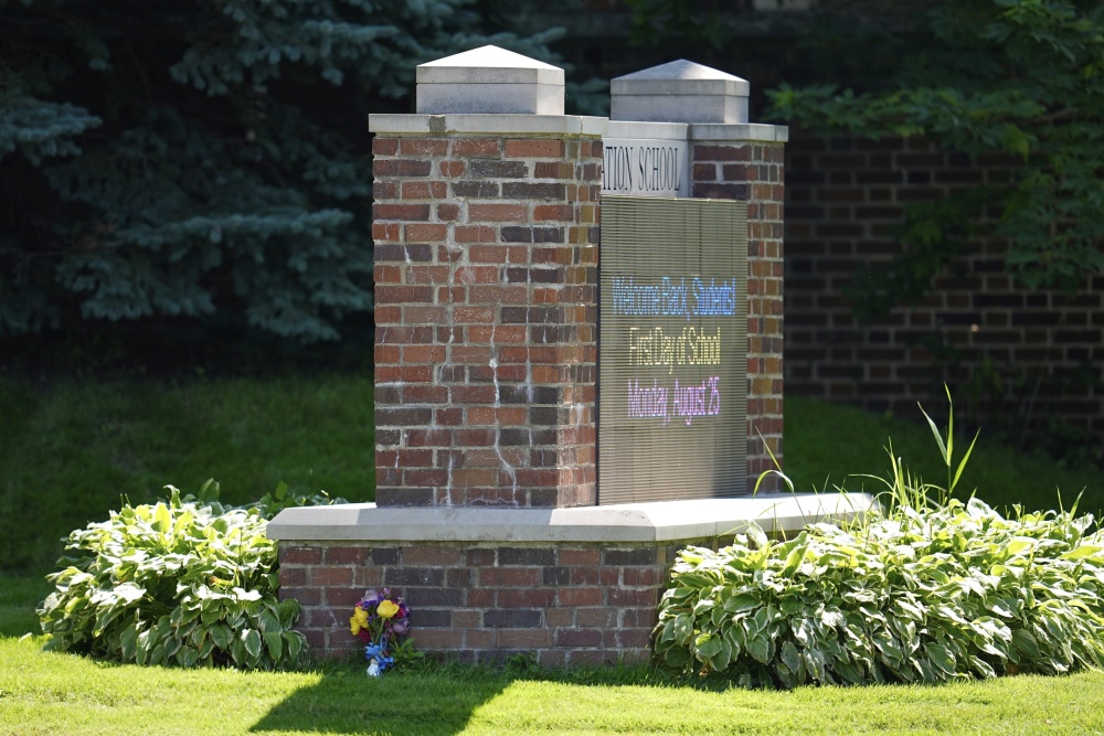 8月27日,在美国明尼苏达州明尼阿波利斯市,一束鲜花摆放在发生枪击事件的学校外。新华社/美联