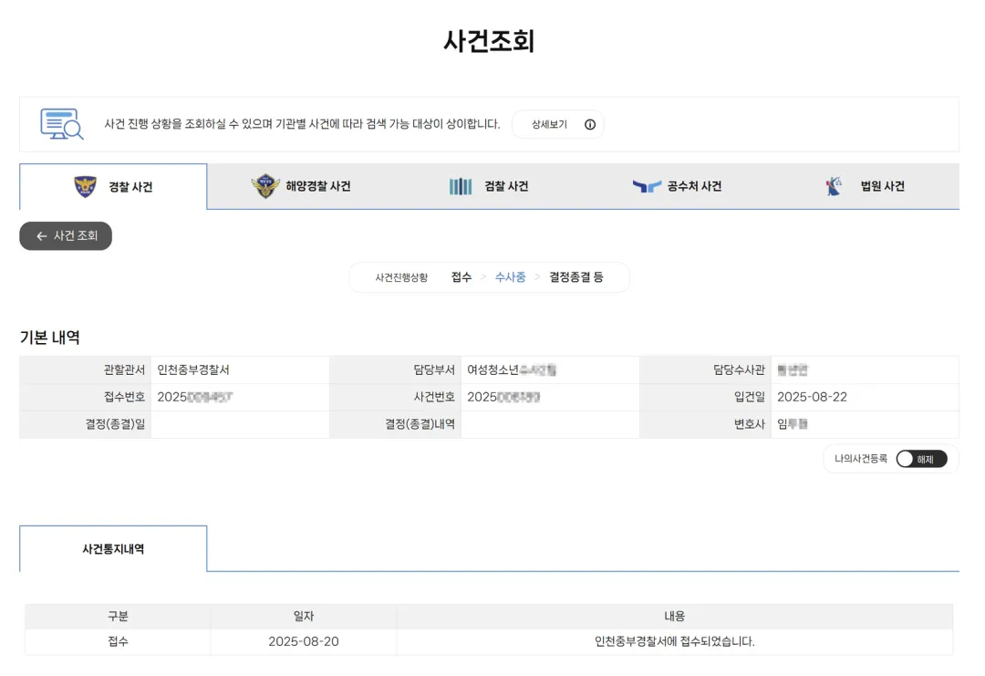 ▲律师提供的韩国警方官方网站案件查询信息截图