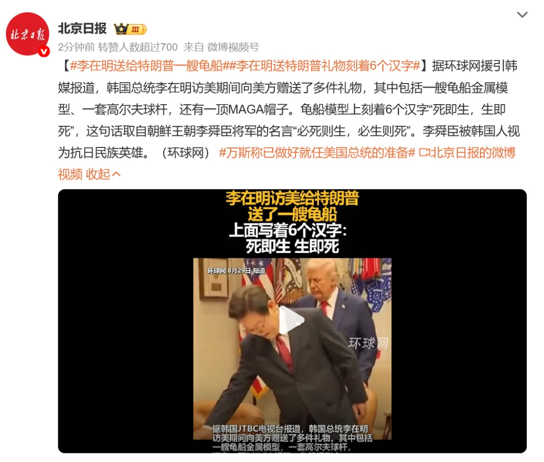 据环球网援引韩媒报道,韩国总统李在明访美期间向美方赠送了多件礼物,其中包括一艘龟船金属模型、一套高尔夫球杆,还有一顶MAGA帽子。