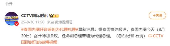 据@CCTV国际时讯消息:据泰国媒体报道,泰国内阁今天(8月30日)召开特别会议,任命副总理普坦为代理总理。(总台记者石玥)