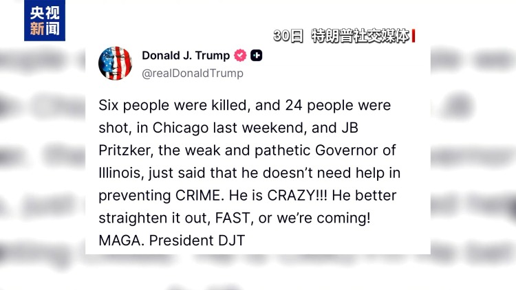 美国总统特朗普30日在社交媒体发文,对伊利诺伊州州长普里茨克不接受军事部署芝加哥的相关表态进行谴责。