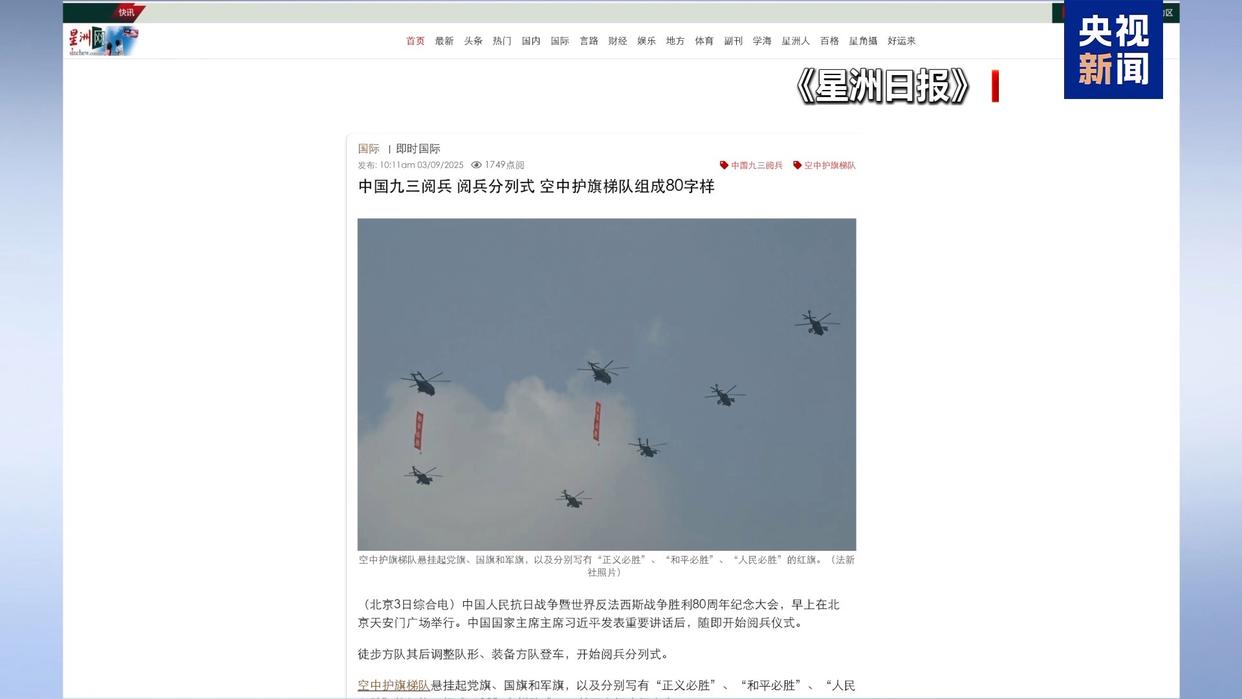 马来西亚最大的华文媒体《星洲日报》详细报道了阅兵仪式现场的各项细节。马来西亚《中国报》则重点介绍了多种新型武器装备和战机,称赞活动是“以盛大阅兵仪式,同世界人民一道纪念这个伟大的日子。”