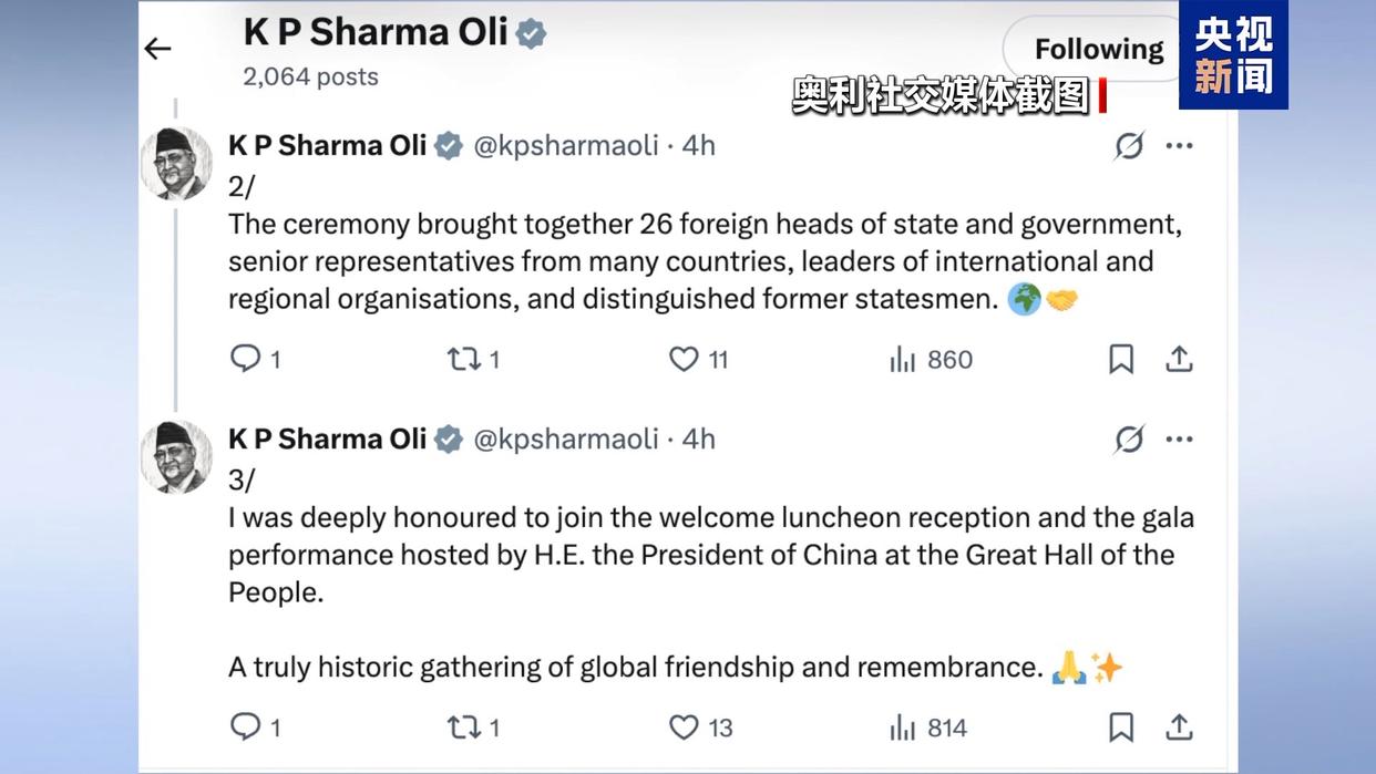 尼泊尔总理奥利在社交媒体发文称赞此次纪念活动为一场“非凡的盛会”。他说,“这是一次真正具有历史意义的全球友谊与纪念盛会”。