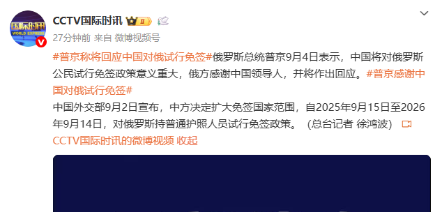 俄罗斯总统普京9月4日表示,中国将对俄罗斯公民试行免签政策意义重大,俄方感谢中国领导人,并将作出回应。#普京感谢中国对俄试行免签#