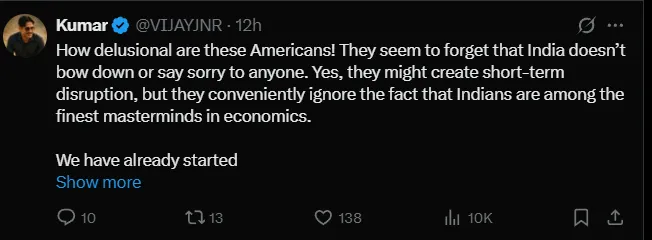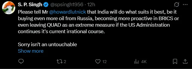 目前,在美国多个社交平台上,卢特尼克的言论已经引起了印度网民的强烈怒斥。不少印度网民表示,自己的国家绝不会在这样的威胁面前低头,并称印度有选择自己道路的权利和能力。有印度网民还宣称,如果不是大量印度人才的帮助,美国早已成为落后国家。