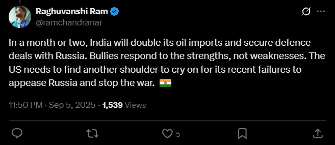 有印度网民还表示,对待霸凌最好的方式不是软弱,而是展现力量,所以印度在1到2个月后不仅不会向美方低头认错,还会进一步与俄罗斯深化关系——反倒是美国到时候会欲哭无泪。