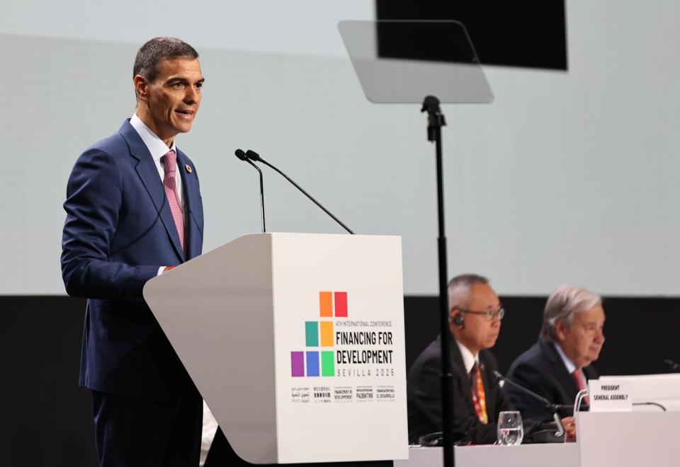 6月30日,在西班牙塞维利亚,西班牙首相桑切斯在联合国第四次发展筹资问题国际会议开幕式上致辞。新华社记者李京摄