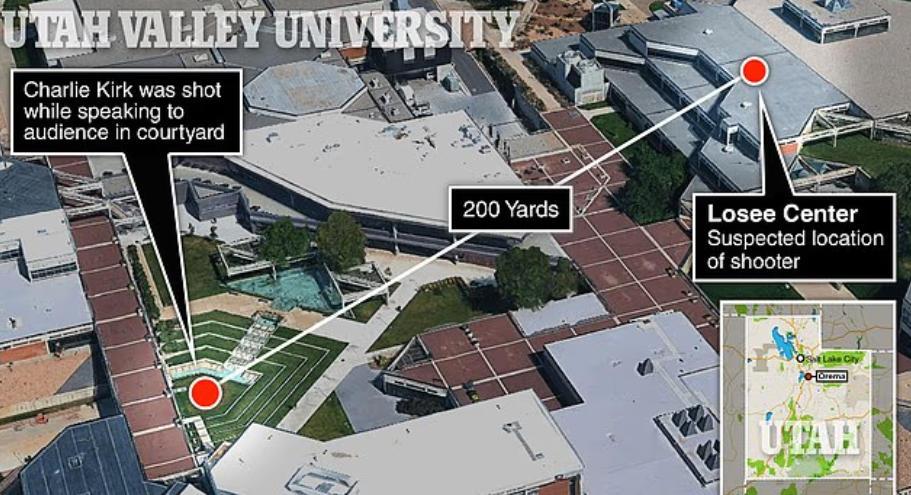▲柯克受枪击地点与疑似枪手位置示意图