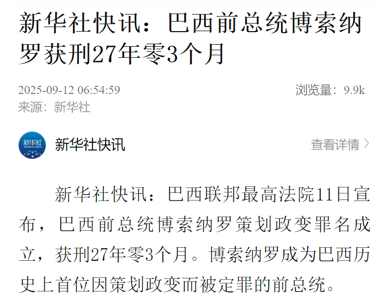 巴西联邦最高法院11日宣布,巴西前总统博索纳罗策划政变罪名成立,获刑27年零3个月。博索纳罗成为巴西历史上首位因策划政变而被定罪的前总统。