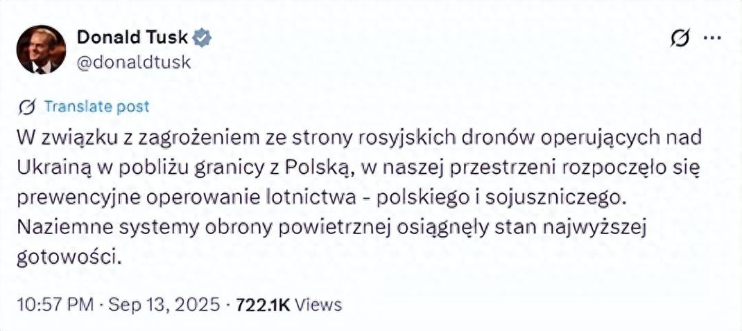△13日,波兰总理图斯克在社交平台X上发帖称,波兰及其盟友已在本国领空展开“预防性”空中行动。